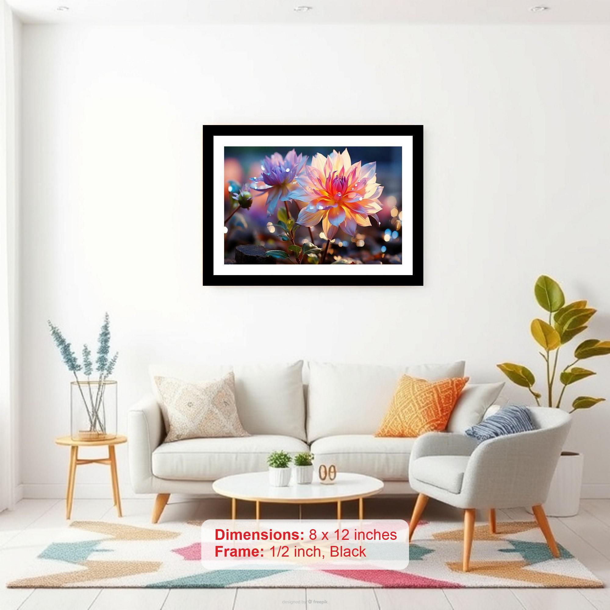 Dew-kissed dahlias glow in the soft, magical light. Wall Art, Interior Accents, Framing Solutions, Residential/Commercial Decor, Premium Gifts | Size: 8 x 12 inches