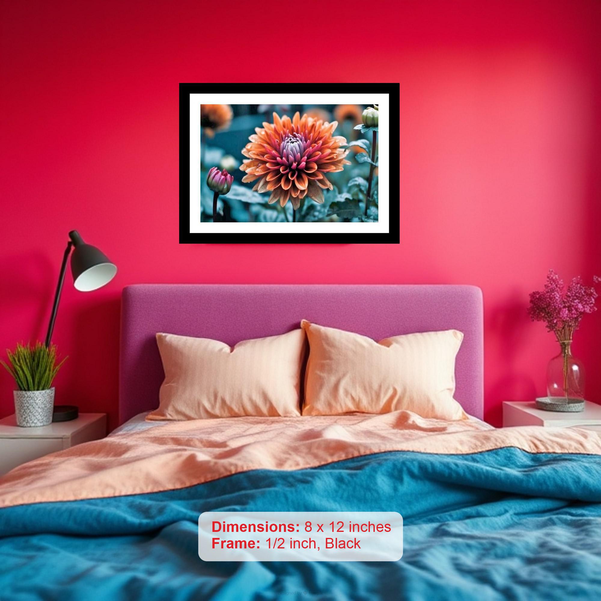 A stunning dahlia bursts with vibrant orange and purple, each petal kissed by glistening raindrops, a captivating image. The reprint's colors pop & print is crisp, bringing this stunning photograph vividly back to life. The digital reprint's striking composition beautifully captures the photograph's essence, breathing new life into the image. Versatile Decor: Ideal for enhancing the aesthetic appeal of living rooms and bedrooms Enhanced Durability: Weather-shield laminated digital print for lasting vibrancy and protection Premium Framing: Constructed with a high-quality, durable fiber frame for long-term stability Precise Dimensions: 30 cm x 20 cm x 1 cm