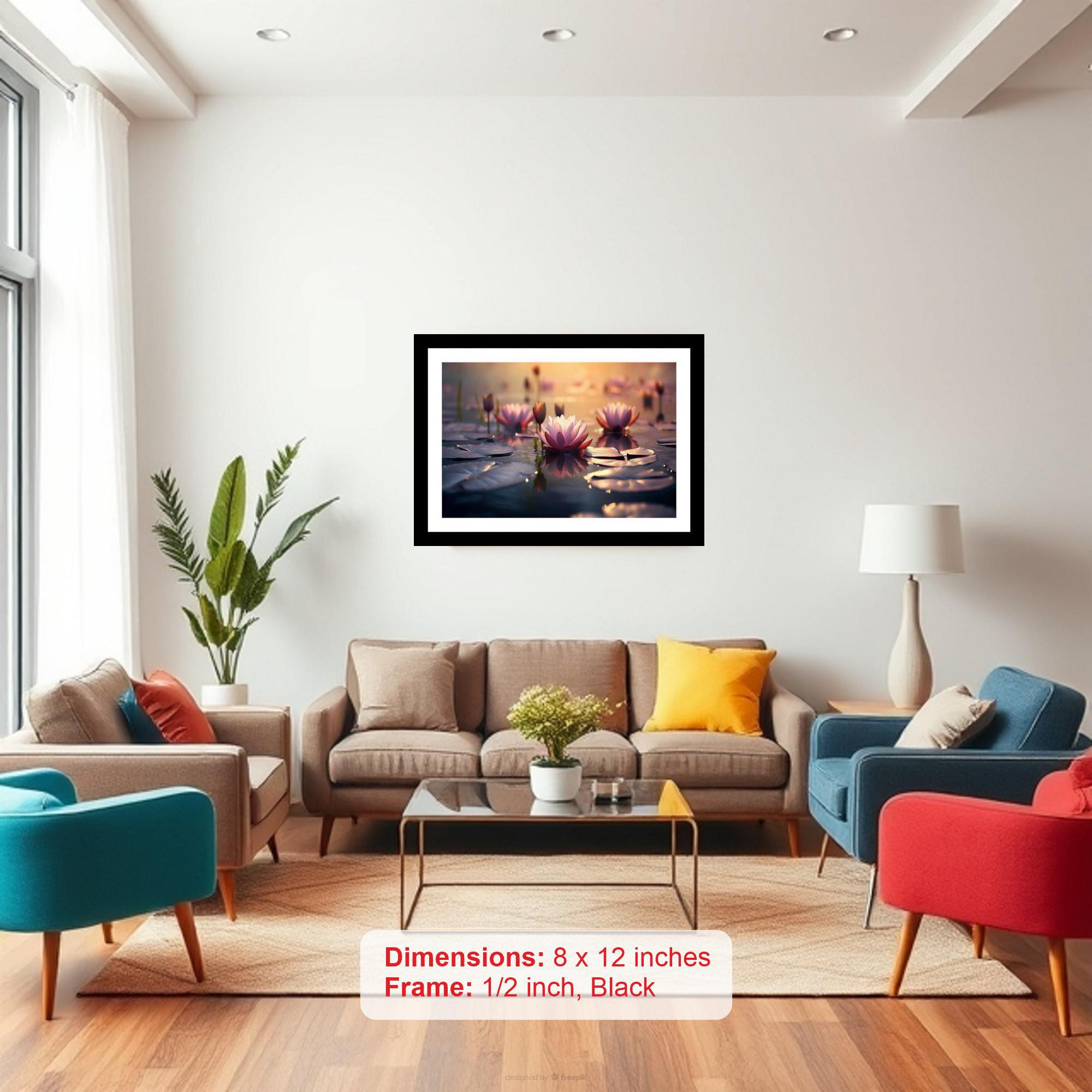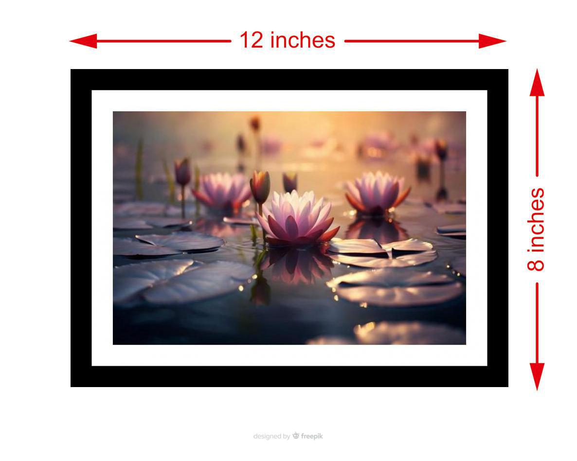 Sunset-kissed water lilies bloom, reflecting serenity and painting a tranquil masterpiece in the water. The reprint's colors are vibrant and true, capturing every detail of the original photograph perfectly. The reprint's composition is stunning; its digital clarity perfectly enhances the photo's original beauty. Versatile Decor: Ideal for enhancing the aesthetic appeal of living rooms and bedrooms Enhanced Durability: Weather-shield laminated digital print for lasting vibrancy and protection Premium Framing: Constructed with a high-quality, durable fiber frame for long-term stability Precise Dimensions: 30 cm x 20 cm x 1 cm