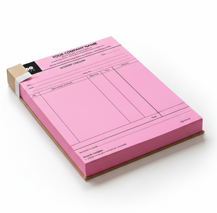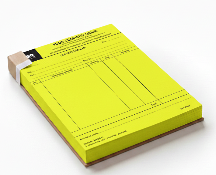 A professional monochromatic printing service for custom delivery challans, featuring high-clarity text, multi-part NCR (carbonless) options, and durable paper designed to streamline logistics, ensure accurate delivery verification, and maintain organized business records.