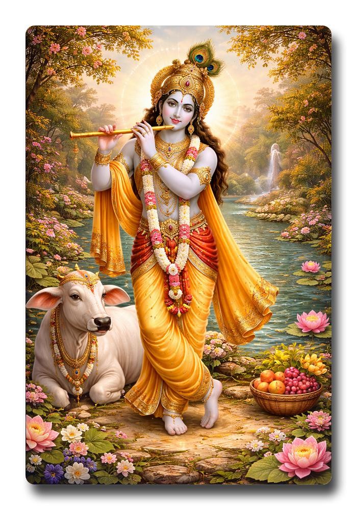 Lord Krishna Flute Play in Blissful Garden with Holy Cow & River - Sparkle Acrylic Photo Frame, Religious Images, Puja Room, Tabletop Framing Solutions, Residential/Commercial Decor, Premium Gifts