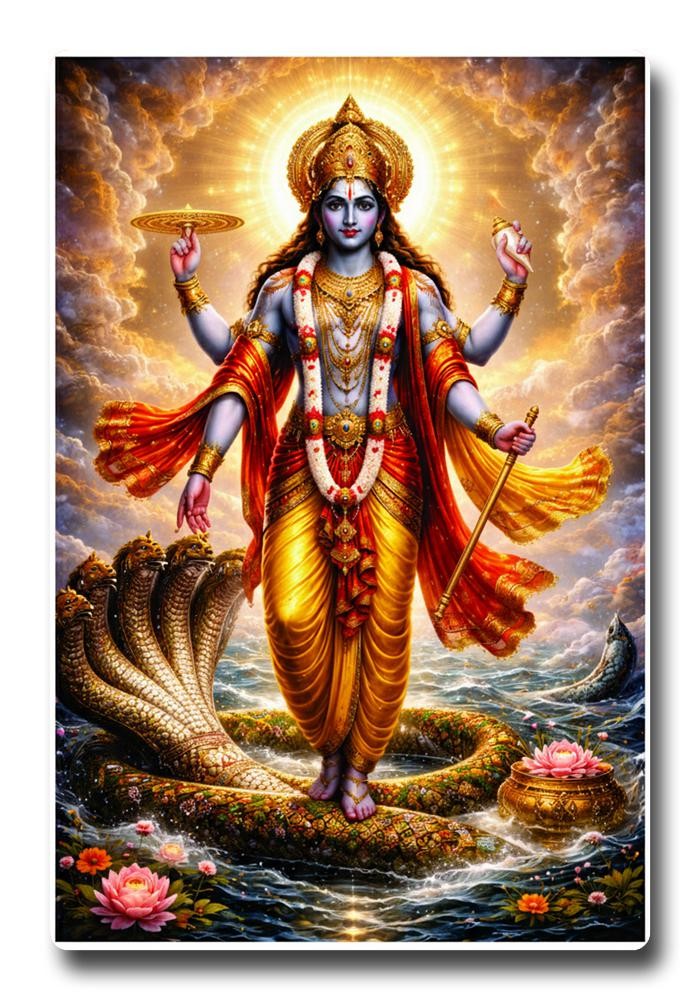 Immerse your space in divine tranquility with this breathtaking sparkle acrylic photo frame, a sacred masterpiece designed to elevate your home or altar. Witness the awe-inspiring depiction of Radiant Lord Vishnu, the preserver of the universe, standing majestically upon the coils of the mighty cosmic serpent Sheshnag. Each detail resonates with spiritual power: Vishnu's serene countenance, his four arms gracefully holding his iconic divine attributes – the conch (Panchajanya), discus (Sudarshana Chakra), mace (Kaumodaki), and lotus (Padma) – symbols of creation, preservation, destruction, and liberation. The entire tableau is set amidst a shimmering celestial ocean, whose ethereal waves seem to ripple with divine energy, perfectly captured and enhanced by the subtle, enchanting sparkle of the premium acrylic material. This high-quality frame isnt just a display piece; its a window to cosmic grandeur, bringing an aura of peace, prosperity, and spiritual contemplation to any environment. The durable, crystal-clear acrylic ensures the vibrant colors and intricate details of this sacred art remain pristine, offering a stunning visual experience without the fragility of traditional glass. Its contemporary design complements any decor, from modern minimalist to traditional opulent. Whether adorning your personal sanctuary, serving as a focal point in your living room, or offered as a profoundly meaningful gift to a loved one, this frame promises to inspire devotion and foster a sense of cosmic connection. Allow the timeless presence of Lord Vishnu on Sheshnag to infuse your surroundings with boundless grace and divine protection. Experience the celestial beauty, clarity, and unique sparkle that make this frame a truly cherished addition to your spiritual collection, reflecting light and devotion in every gleam.