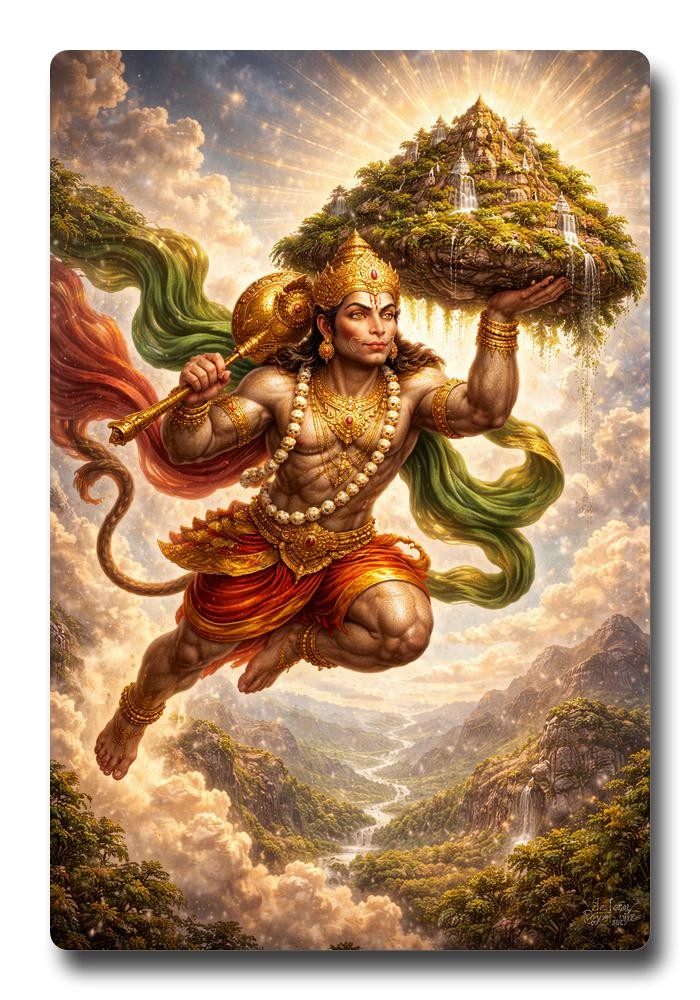Experience divine strength and unwavering devotion captured in our breathtaking sparkle acrylic photo frame, a magnificent tribute to the indomitable Lord Hanuman. This exquisite piece depicts the legendary moment when the mighty son of Vayu, driven by boundless compassion, soars majestically through swirling celestial clouds, his powerful form radiating an aura of heroic determination. With unparalleled resolve, he clutches the colossal Dronagiri mountain, plucked entirely from its roots, to secure the life-saving Sanjeevani herb for Lakshmana. Every vibrant detail, from Hanuman's muscular contours to the swirling clouds and rugged mountain texture, is rendered with clarity. The sparkle acrylic material adds an enchanting dimension, infusing the scene with a subtle, dynamic shimmer that brings the epic tale to life, making light dance around the divine hero. More than decor, it is a profound symbol of courage, selflessness, and good's triumph over adversity. Place it in your home, office, or sacred space to invoke blessings of strength, protection, and devotion. A constant reminder of faith's power and noble purpose's potential, this durable, high-quality acrylic frame ensures your cherished depiction remains vivid and pristine for years, resisting fade and damage. Its sleek, modern design integrates into any decor, its inspiring artwork a focal point. This exceptional frame makes a thoughtful, profound gift for devotees, spiritual seekers, or anyone appreciating epic mythology and its embodied virtues. Bring home a piece of timeless legend, a powerful symbol of hope and unwavering spirit, featuring Lord Hanuman's iconic, life-altering mission. Let this frame inspire daily strength and resilience, reminding of devotion's limitless possibilities, unparalleled loyalty, and an unwavering commitment to dharma, beautifully encapsulated within a sparkling, durable presentation that commands reverence.