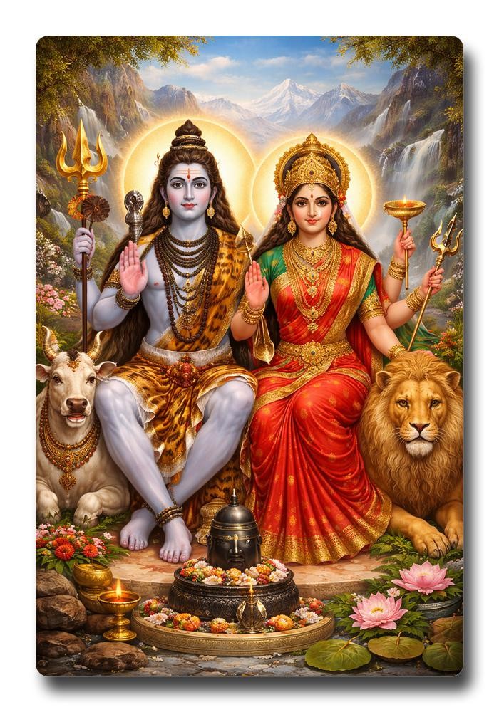 Elevate your sacred space with our magnificent Sparkle Acrylic Photo Frame, a radiant masterpiece bringing divine energy and serene beauty into your home. This awe-inspiring artwork captures Lord Shiva and Goddess Parvati, eternally united, bestowing boundless blessings from their majestic mountain sanctuary. Witness powerful Shiva alongside divine consort Parvati, their forms emanating peace and spiritual strength. Faithfully by their side is Nandi, the sacred bull, epitomizing devotion, while a majestic lion, symbolizing courage and dharma, guards their celestial abode. This sacred ensemble creates a visual narrative of cosmic harmony and grace, inviting auspiciousness and tranquility. Crafted from high-quality sparkle acrylic, this frame is a shimmering portal to the divine. The innovative material subtly reflects light, giving the image a captivating, ethereal glow that makes the deities appear radiant and alive. Every intricate detail, from Shiva's trishul to Parvati's gentle gaze, is beautifully enhanced by the frame's luminous quality, ensuring spiritual power resonates deeply. Its durable, modern design ensures it will be a cherished centerpiece for years, offering a contemporary twist to traditional devotion. Perfect for your puja altar, meditation room, living room, or office, it serves as a constant reminder of divine protection, love, and wisdom. This makes an exceptionally thoughtful gift for devotees, family, and friends on special occasions like Diwali, housewarmings, weddings, or birthdays, sharing the blessings of Shiva and Parvati. Infuse your environment with sacred vibrations and timeless elegance; embrace this exquisite depiction of divine grace and transform any space into a sanctuary of peace and inspiration. Let the radiant energy of Shiva and Parvati fill your home, guiding you towards inner harmony and spiritual well-being.