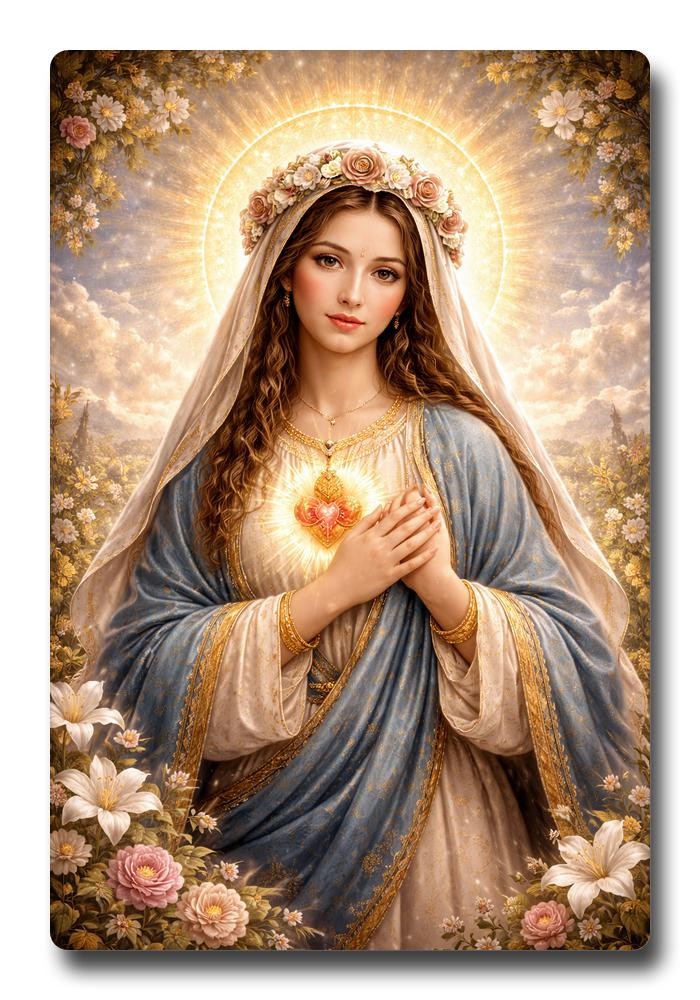 Immerse your living space in divine tranquility and radiant beauty with our breathtaking sparkle acrylic photo frame. This exquisite artwork beautifully captures The Virgin Mary, radiating deep serenity amidst a lush, vibrant floral garden. Her gentle, compassionate gaze, adorned with a delicate rose crown, brings peace and comfort. Draped in her timeless blue mantle, a symbol of heaven and grace, Mary's maternal presence is both powerful and soothing. The spiritual heart of this depiction emanates from her chest: her Immaculate Heart, rendered with an ethereal glow, vividly symbolizing pure, unconditional love and unwavering devotion. Crafted from premium, high-quality sparkle acrylic, this unique frame offers a brilliant, crystal-clear presentation, making colors rich and spiritual essence resonant. Unlike fragile glass, our advanced acrylic is exceptionally lightweight, shatter-resistant, and durable, ensuring this cherished image remains pristine and vibrant for years, a beacon of faith. The subtle, integrated sparkle within the acrylic provides an enchanting, celestial shimmer, catching ambient light to create a reverent display that deepens any room's spiritual atmosphere. Perfectly suited for your home altar, prayer corner, bedside, child's bedroom, or as an inspiring focal point in your living room or office, it serves as a constant reminder of faith, hope, and divine protection. Beyond personal contemplation, this framed artwork makes a profoundly thoughtful and cherished gift for religious milestones and special occasions. Present it for Baptisms, Confirmations, First Communions, weddings, anniversaries, birthdays, or holidays. It's ideal for anyone seeking a deeper spiritual connection, expressing devotion, or adorning their home with sacred art. Elevate your home decor and spiritual practice with this stunning, timeless portrayal of the Mother of God, a universal symbol of maternal love, intercession, and divine grace.