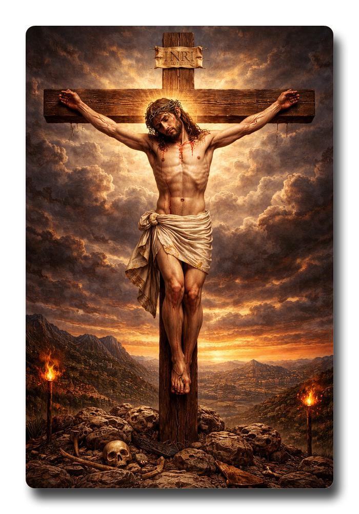 Embrace profound faith and spiritual devotion with our exquisite Sparkle Acrylic Photo Frame. This deeply moving piece presents a powerful depiction of Jesus Christ crucified, portraying our Lord crowned with thorns and bleeding, a stark testament to His immense sacrifice. The dramatic, cloudy sky in the background amplifies the solemnity, while the poignant detail of a skull at the cross's base adds profound symbolism. Crafted from high-quality sparkle acrylic, this frame radiates an ethereal glow, enhancing the vibrant details and bringing this sacred scene to life with an almost divine luminescence. It is perfect for personal reflection, prayer, or as a focal point in any spiritual space. This durable and visually striking artwork is ideal for your home altar, prayer room, or living area, serving as a constant reminder of redemption and grace. Gift this meaningful symbol of faith to a loved one, or adorn your own sanctuary with this cherished representation of divine sacrifice. Experience the deep spiritual connection this unique frame offers, a beautiful and enduring testament to the foundational story of Christianity, designed to inspire contemplation and strengthen your walk of faith every single day.